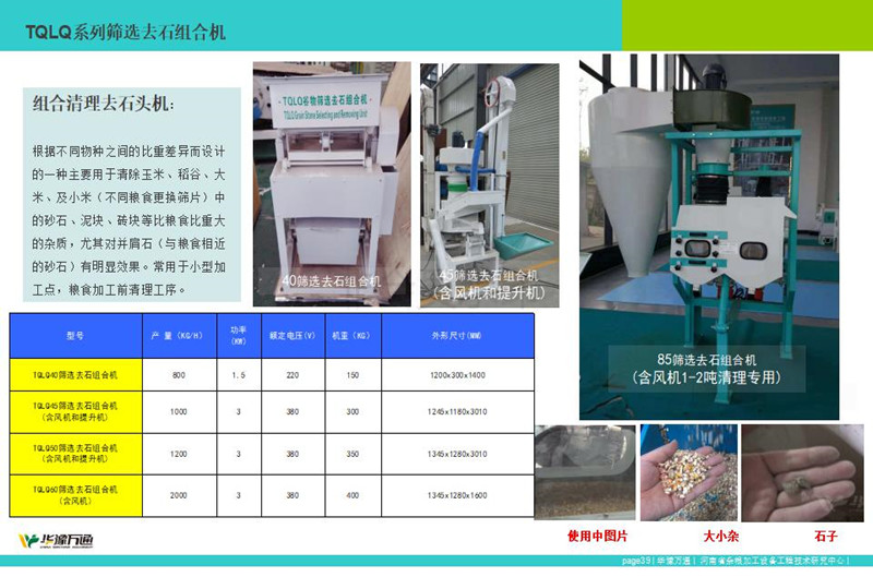 華豫萬通生產(chǎn)的TQLS系列組合清理去石機,該系列組合型清理去石機整合風(fēng)機、振動篩、去石機為一體的糧食清理設(shè)備,常應(yīng)用于糧食加工中清理去除大中小雜、石頭以及輕雜。其中TQLS-45型清理去石機常應(yīng)用1噸下糧食清理,而TQLS-85組合清理去石機,精工制作常應(yīng)用于30噸左右糧食加工生產(chǎn)線的前段清理工序。