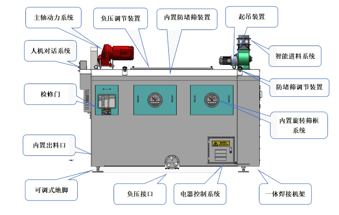 3、篩孔防堵系統(tǒng):可實現(xiàn)對設備篩孔不間斷的清里,防止篩孔堵塞。
